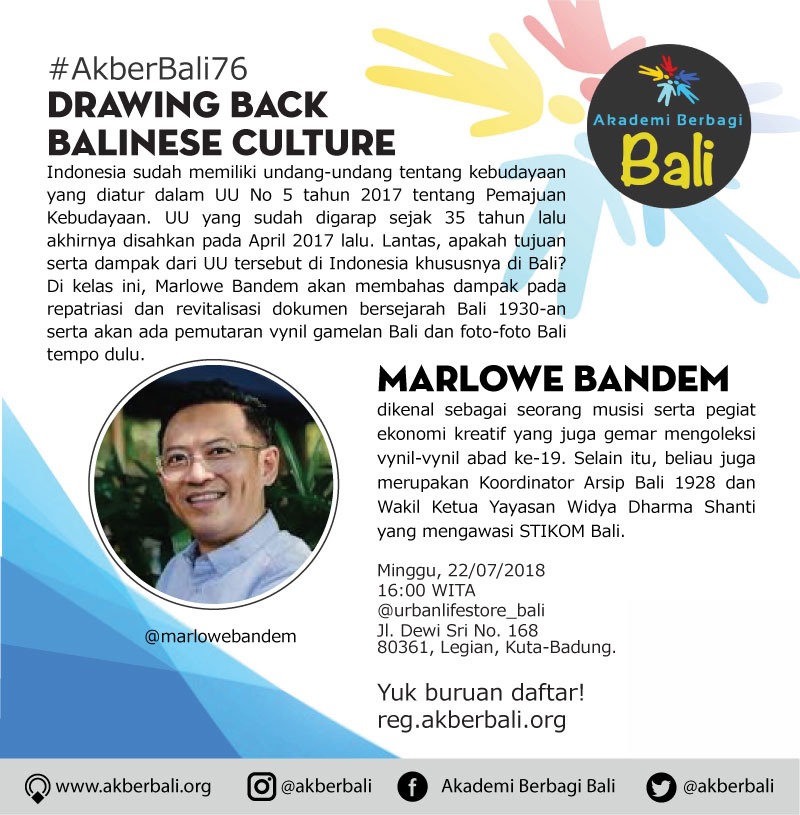 Agenda: Presentasi Menggali Masa Lalu Demi Masa Depan Kreatif (20 menit) dan Sinema Bali 1928 (60 menit) pada acara Akademi Berbagai (Akber) Bali #76